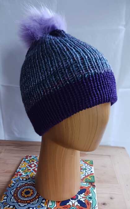 Purple Mix/Plain Purple Reversible Hat - Removable faux fur pom-pom - £16.00